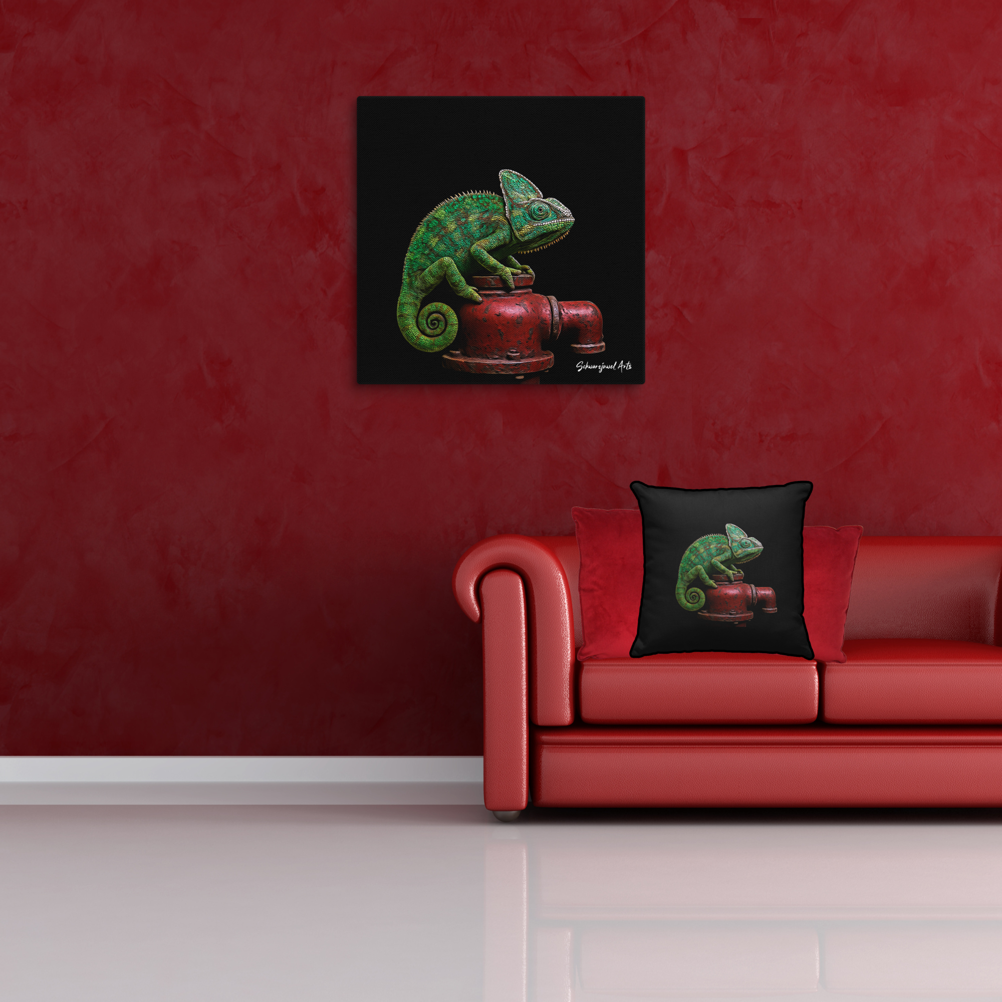 Chamäleons sind spezialisierte Reptilien, die vor allem für ihre Fähigkeit zur Farbveränderung bekannt sind. Diese dient nicht – wie oft angenommen – der Tarnung, sondern hauptsächlich der Kommunikation. Mit ihren greifenden Füßen, dem wickelbaren Greifschwanz und den unabhängig beweglichen Augen sind sie perfekt auf das Leben in Bäumen angepasst. Das Bild zeigt ein Chamäleon auf einem verwitterten Hydranten – ein technisches Objekt, das im starken Kontrast zur natürlichen Herkunft des Tieres steht. Dennoch wirkt es, als gehöre es dorthin. Diese Szene unterstreicht das, wofür Chamäleons stehen: Anpassung, Präzision und Balance – auch in ungewohnten Umgebungen.